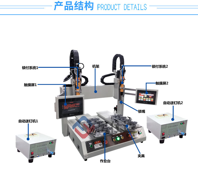 雙系統坐標式鎖螺絲機具有坐標式所有優點,不同的是雙鎖付系統采用兩臺獨立的自動送釘機和電批,分別用PLC控制各自電批的工作路徑,一臺設備可同時完成不同產品的螺絲鎖付工作,也可完成同一產品不同部位螺絲的鎖付工作,設備功能與普通坐標式自動擰螺絲機類似,搭配觸摸屏即可操作,可自行更改鎖付路徑。設備功能更完善。