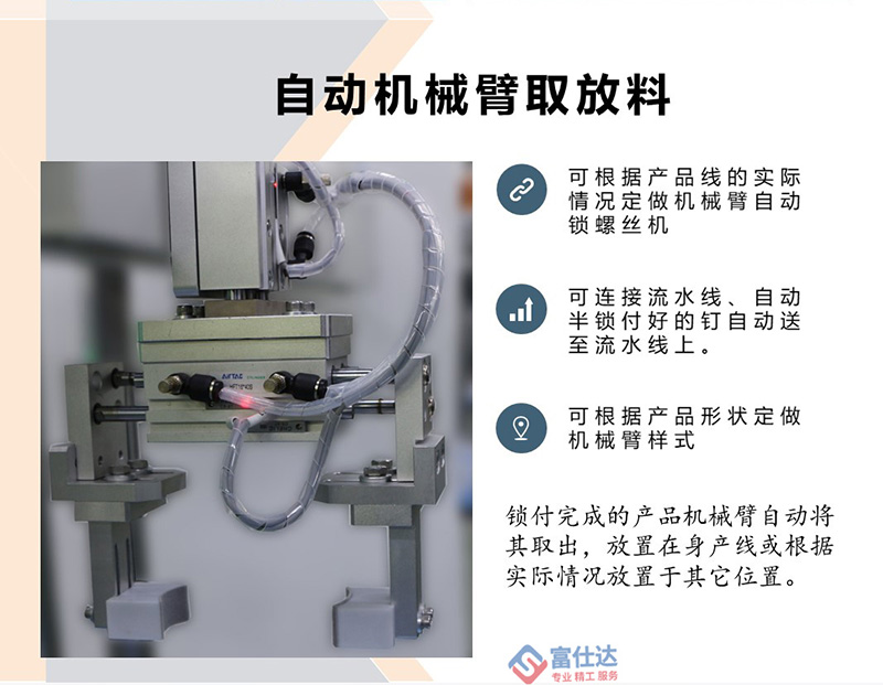 深圳市富仕達自動化設備有限公司是國內領先的以自動鎖螺絲設備為核心的自動化設備制造商,堅持以客戶需求為中心,定制自動化鎖螺絲方案,已有超過4000家企業采用富仕達定制的自動鎖螺絲設備實現“機器換人”,節省大量人力成本。